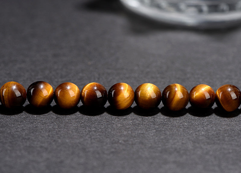Tiger's eye, also known as "tiger's eye stone," exhibits bright, flowing silky bands on its surface. These bands move with the viewing angle, resembling elongated pupils. The color and shape of tiger's eye resemble a tiger, exuding nobility and power, hence its name. Yellow tiger's eye is characterized by alternating black and yellow stripes; its unique texture resembles the mottled stripes of a tiger, possessing a steady yet resolute strength, as powerful as a Vajra. Lightning yellow tiger's eye is fine-grained and tough, a particularly dazzling tiger's eye with clear and complete patterns. The darker areas are rich and deep; when the bead is rotated, the tiger's eye effect changes dynamically, displaying a majestic and powerful aura.